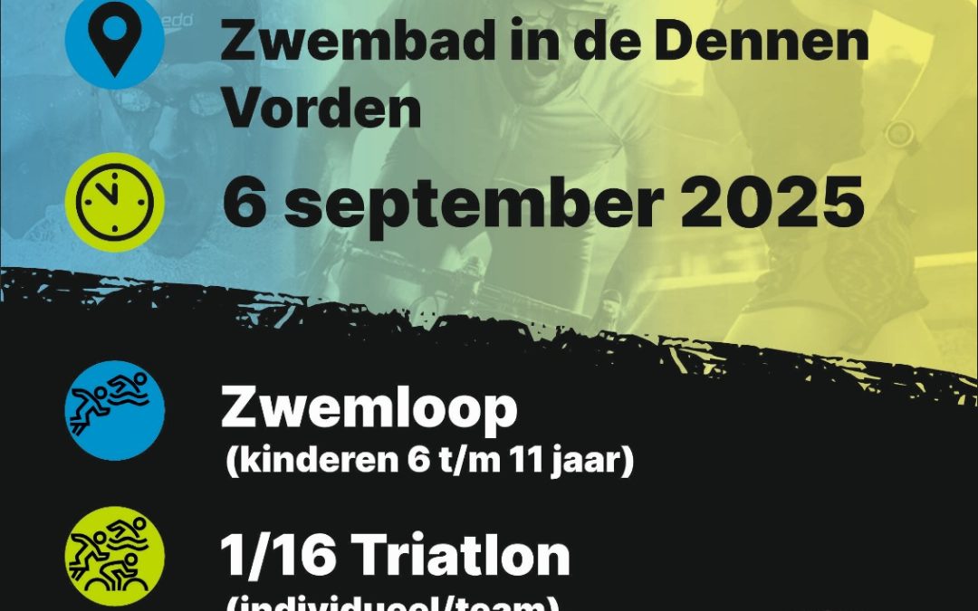 Crosstriatlon Vorden 2025 door Nick Ziggers | mei 17, 2025 | Actueel De crosstriatlon van Vorden wordt op 6 september 2025 gehouden vanuit zwembad In de Dennen. Voor meer informatie bezoek: de website van de crosstriatlon Vorden.